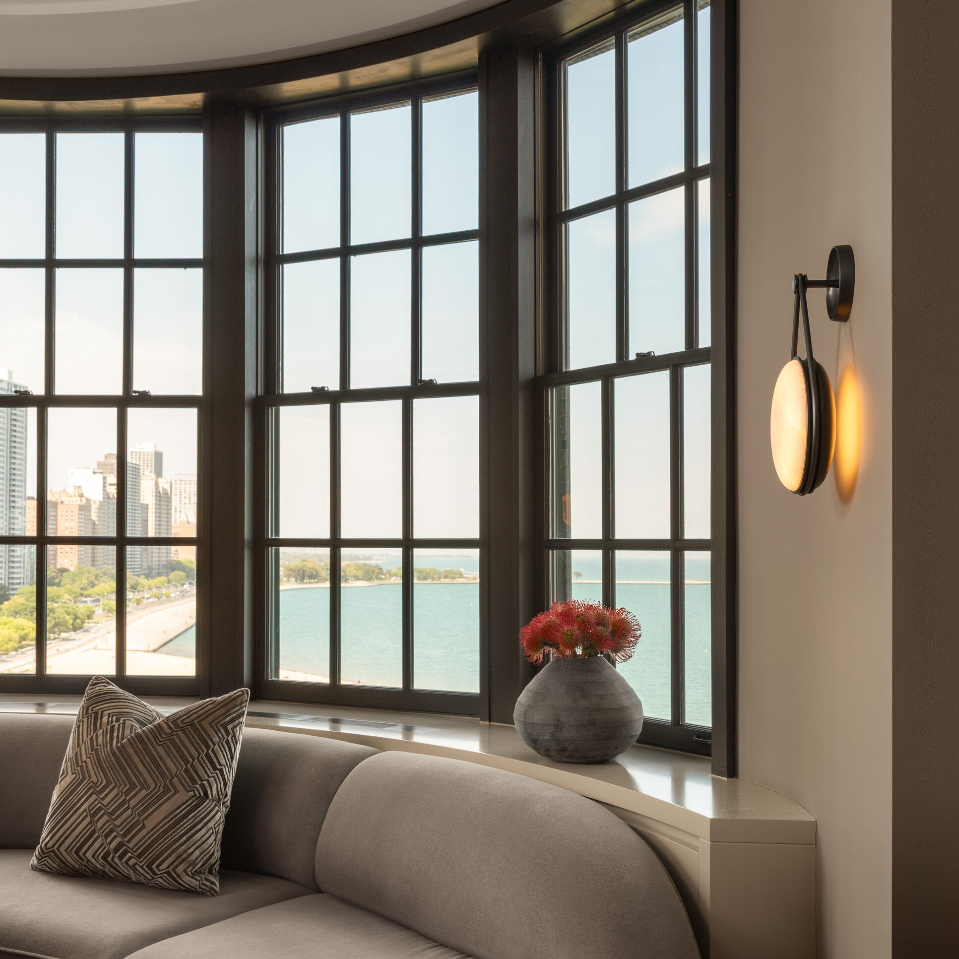 Singular, but far from alone, Monos offers a beautiful illusion, in which glass and metal merge seamlessly, creating a monochromatic effect. Like a stormy sea, smoked glass fades to clear. Metal plates gently curve, beckoning you to come closer. Interchangeable glass and stone lenses allow for the ultimate in customization. Available in multiple sconce, pendant, and chandelier designs, all in six finishes.