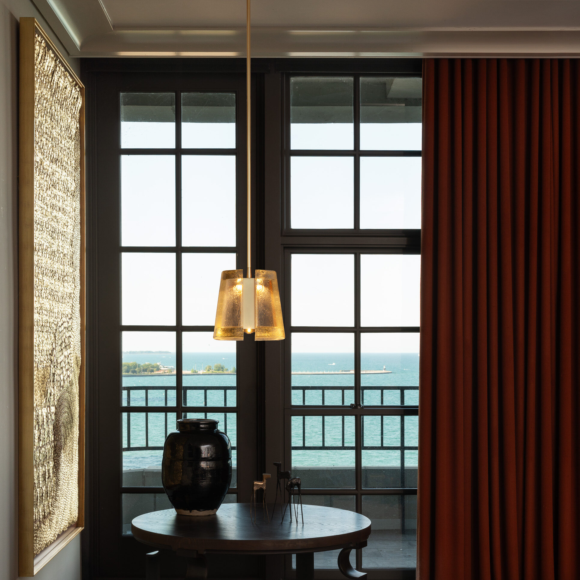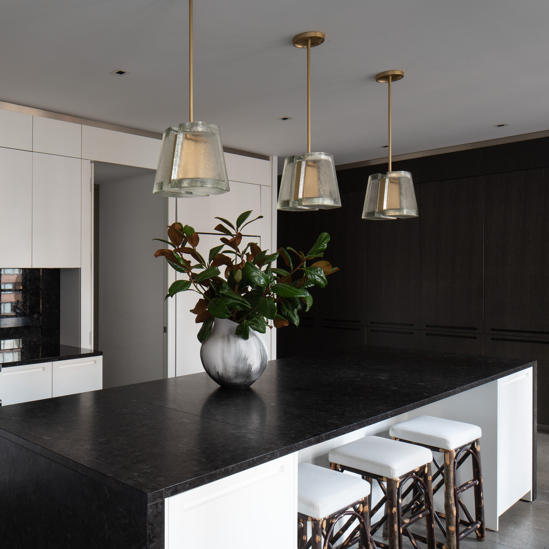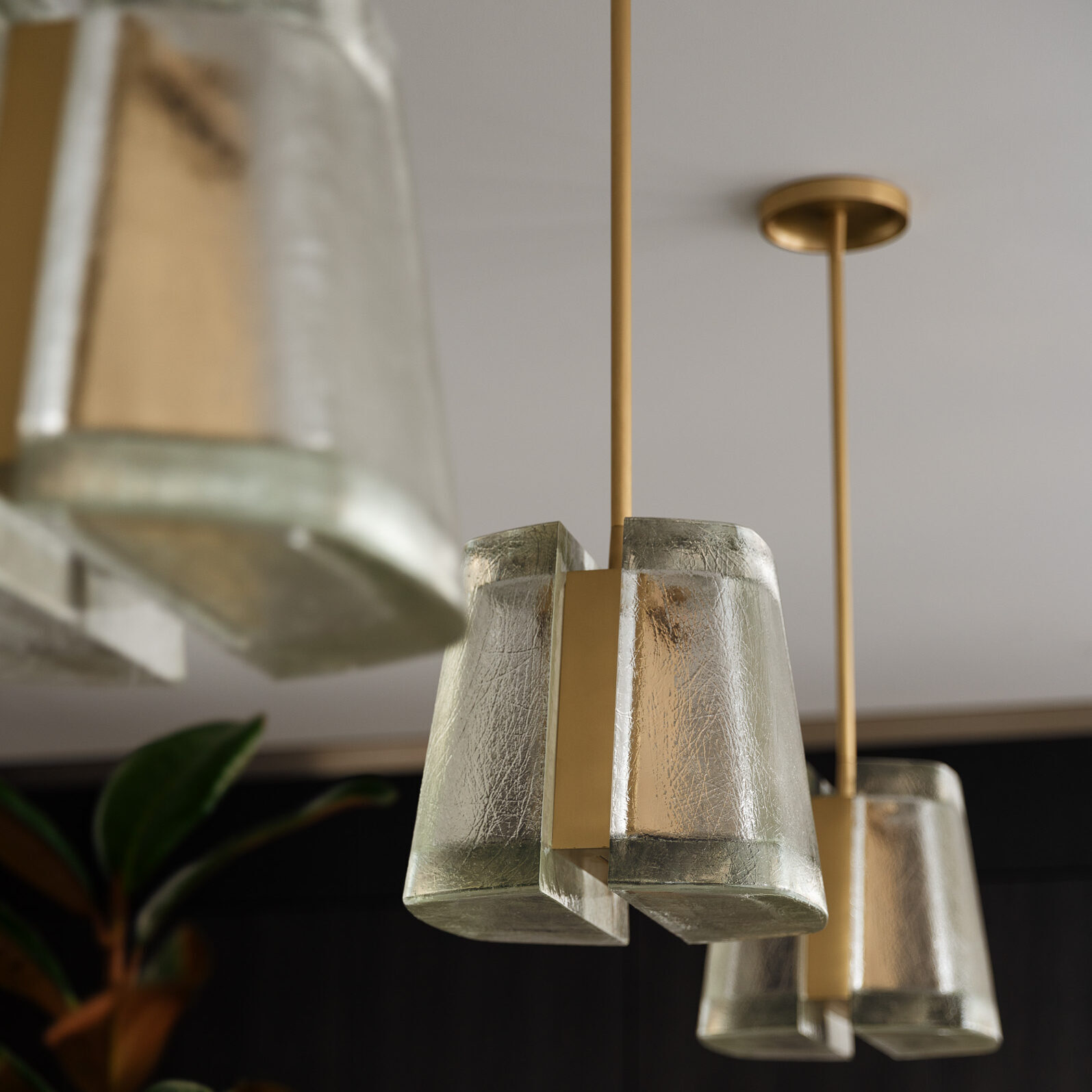 Named after the goddess of sight and vision, Thea is coyly ambiguous, leaving the door open to much interpretation. A melting slab of ice, a module careening through space and time, a 100-year-old chunk of glass that was unearthed and reworked for a new chapter. Available in pendant, sconce and chandelier forms, Thea’s silver, gold, and richly toned metalwork is encased in hand-etched cast glass evoking the trace of time.